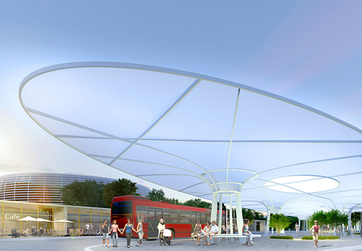 Angestrebt wird ein „transitorischer“ Raum von urbaner und lebendiger Qualität, welcher derzeit schmerzlich vermisst wird. Neben einem zeitgemäßen, leichten Dach, welches sich in der inneren Organisation von den Zwängen der linearen Aufreihung der Busse löst, ohne an Funktionalität einzubüßen, ist eine raumbildende Umfassung des Gesamtraumes mittelfristig unabdingbar, um sich formal von den historischen Bindungen der hier vorgedachten, autogerechten Stadt zu lösen.