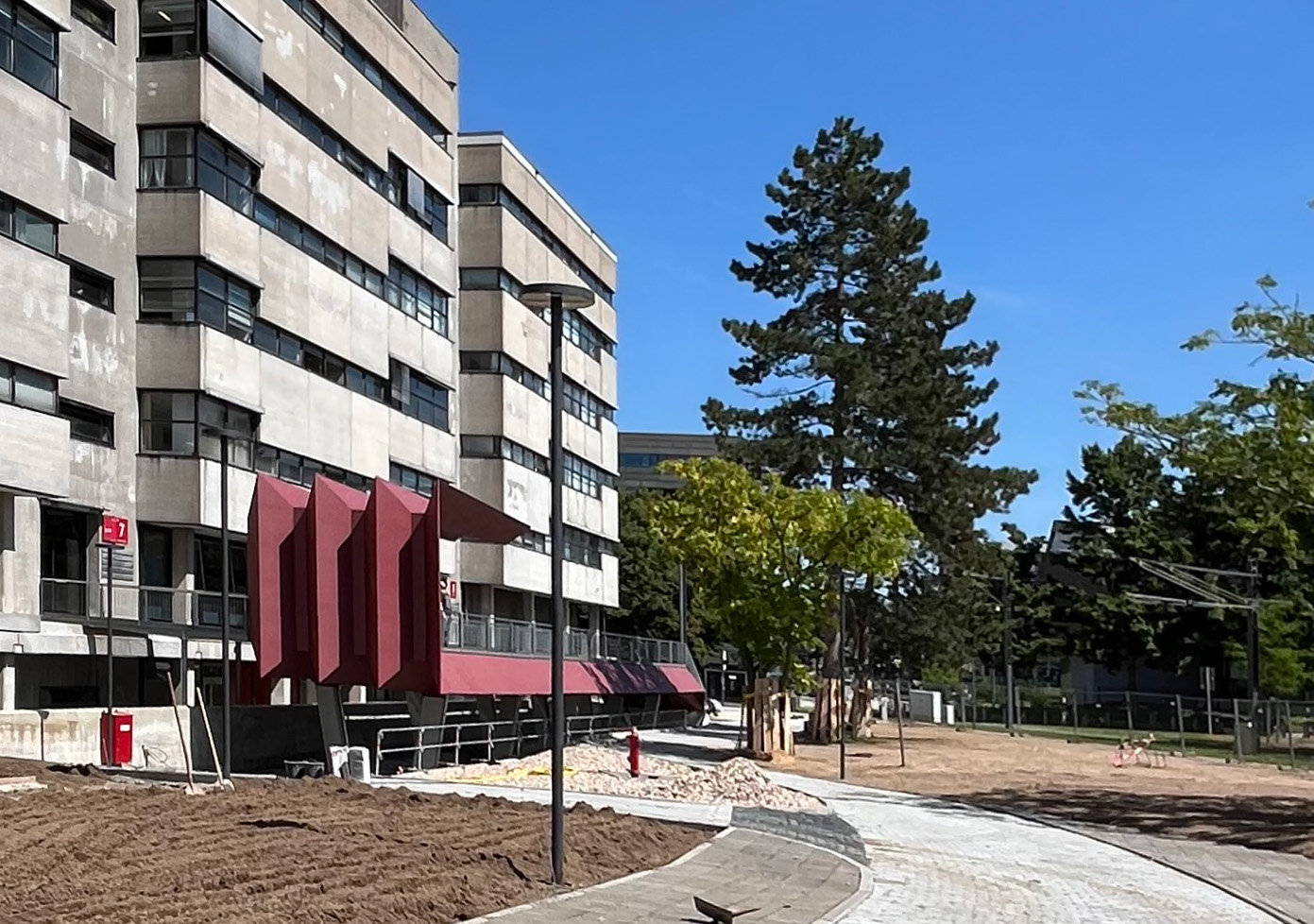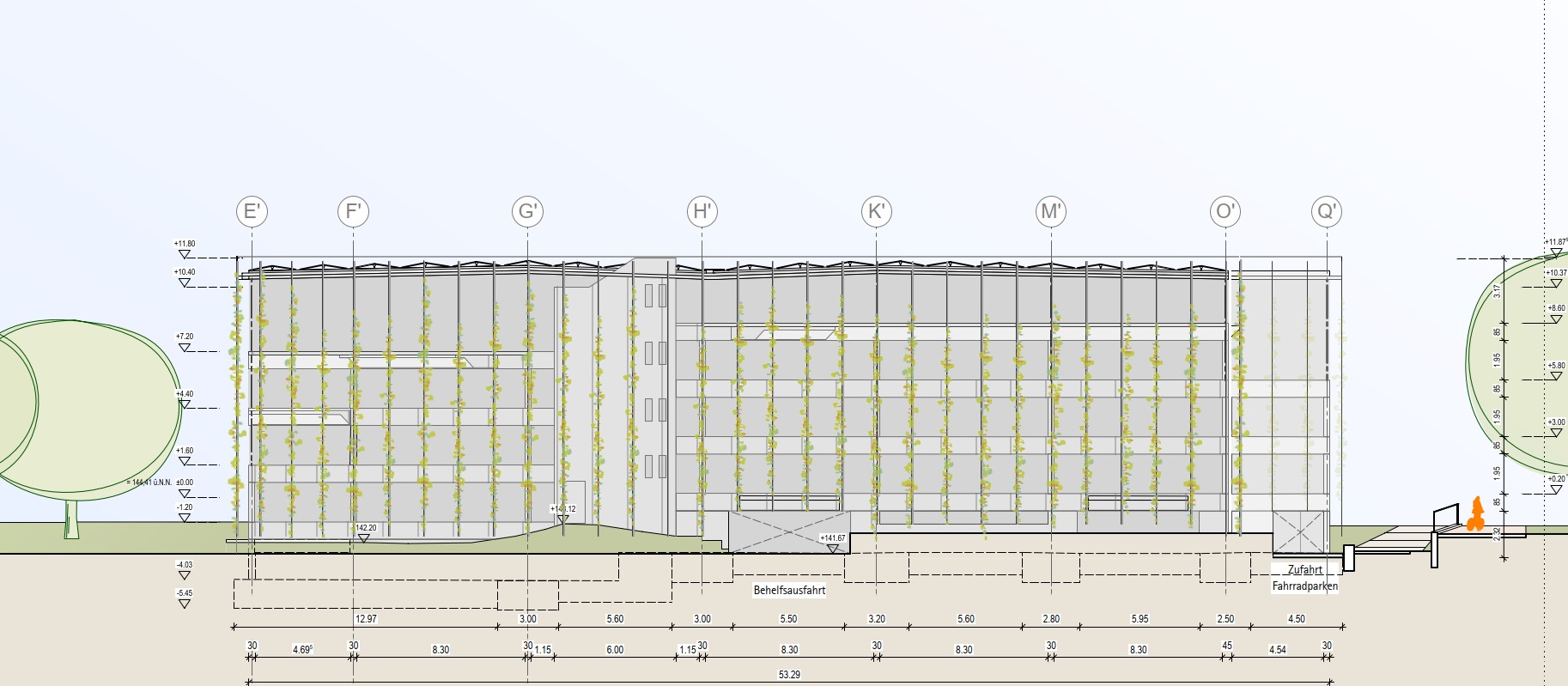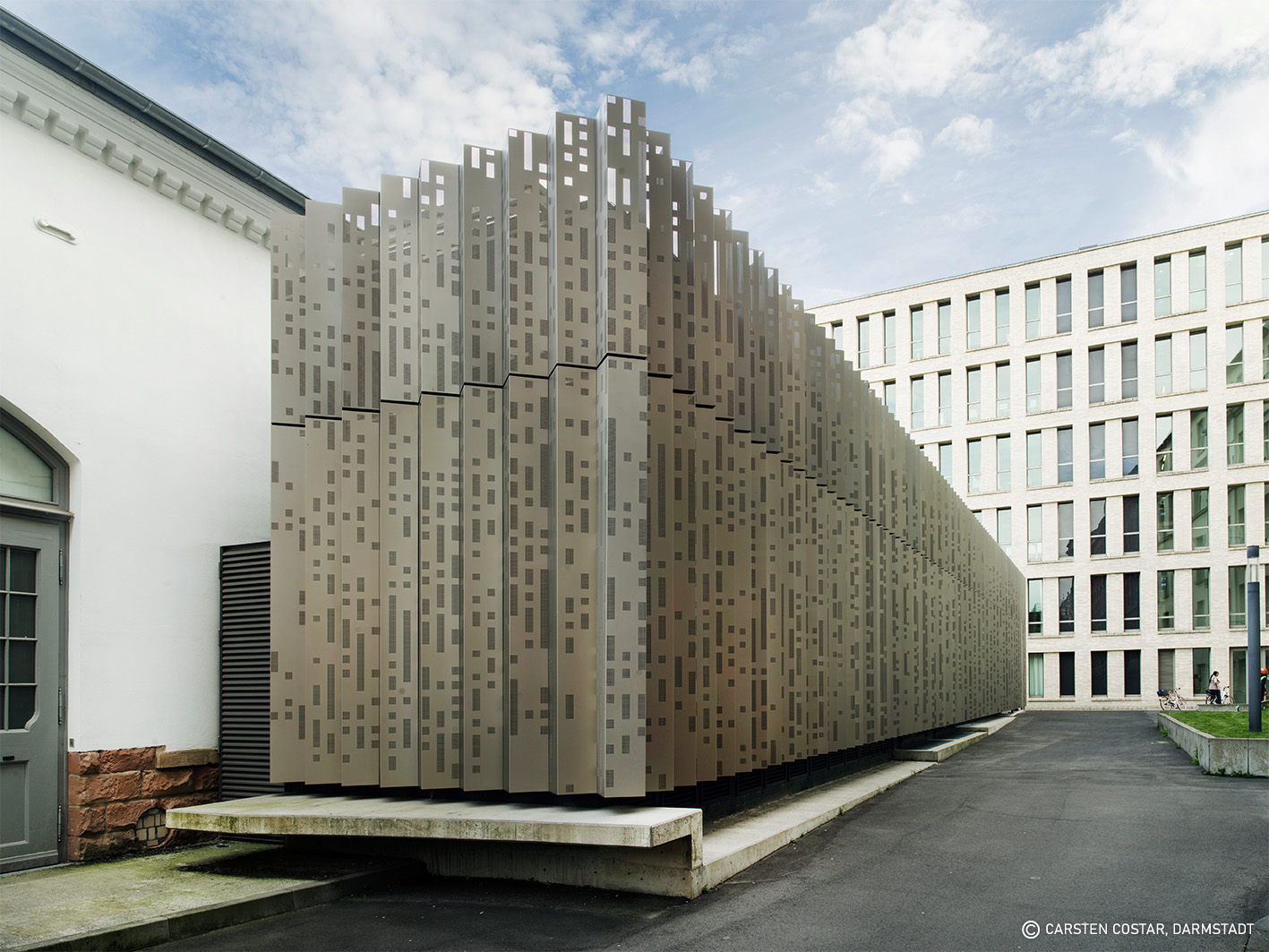 Die gefaltete Vorhangfassade am Maschinenhaus ist montiert und damit abgeschlossen.