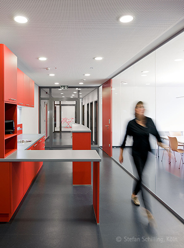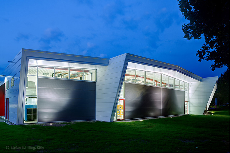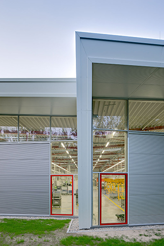 Strukturell wurde die alte Halle fortgeführt in Bezug auf die Baufluchten und auf das Achsraster der Stahlkonstruktion, wobei das neue Dachtragwerk aus einem unterspannten Stahlträger besteht, der in seinen Dimensionen die Effizienz des Materials Stahl zeigt und dadurch ein Höchstmaß an Transparenz in der Halle erzeugt. Verbunden mit Oberlichtbändern, die gleichzeitig die Funktion des Rauch- und Wärmeabzuges übernehmen, ist die Halle -trotz überwiegend geschlossener Wände- ein außerordentlich heller, von Tageslicht durchfluteter Arbeitsraum geworden.
