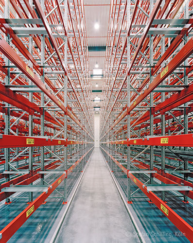 Die Halle für Warenein und -ausgang, in der sich die meisten Arbeitsplätze befinden, hat einen hohen Anteil an Tageslicht, welches durch das Oberlichtband im Dach sowie durch die Fenster entlang der Fassade einfällt. Verstärkt wird die freundliche Atmosphäre durch die hellen Oberflächen von Sichtbeton, Fassaden- und Dachblechen sowie der innovativen Wandbekleidung des Hochregallagers aus Streckmetall.