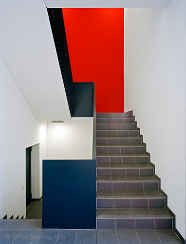 Sozialräume und Technikflächen ordnen sich peripher des beschriebenen Rückgrates an. Der Bedarf an zusätzlichen Büroflächen im Bereich Logistik, wurde durch die Überbauung der Überladebrücken im 1. OG gedeckt: eine einbündige Bürospange -mit Blick auf die Anlieferungszone- gibt dem Warenein- und -ausgang ein charakteristisches Erscheinungsbild.