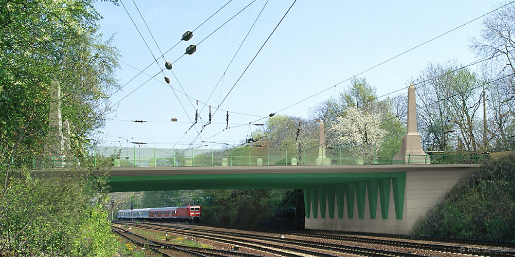 Der Leitgedanke für den Entwurf bestand in der Integration der historischen Brückenaufbauten in einen zeitgemäßen Brückenneubau. Aufgrund der geringen zur Verfügung stehenden Bauhöhe und der Forderung nach stützenfreier Überbauung der Bahngleise wurde das Brückenbauwerk als fugen- und lagerloses Einfeld-Rahmentragwerk in Verbundbauweise ausgeführt.