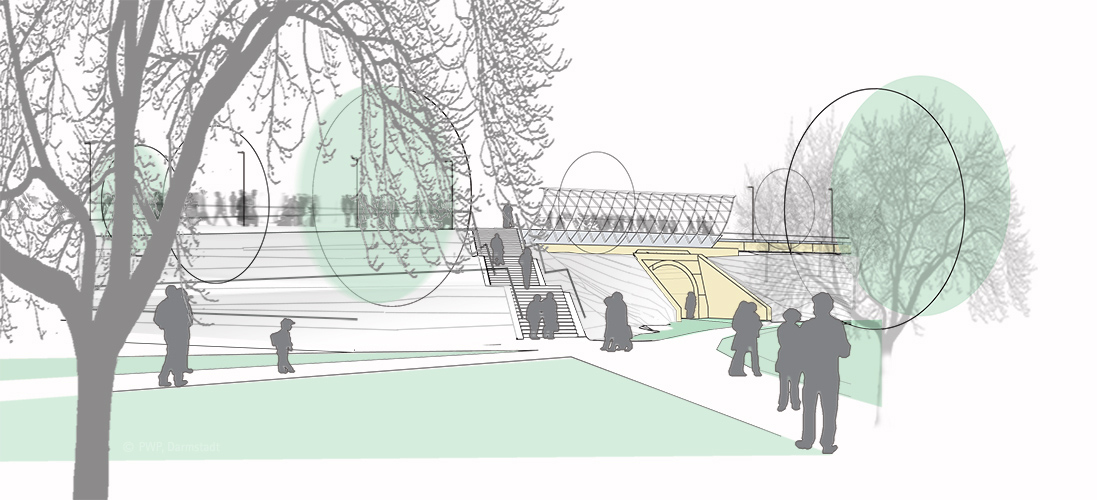 Der Entwurf basiert auf einem Lösungsansatz, welcher insbesondere den Bereich des Darmbaches unangetastet ließ und sich harmonisch in das bestehende Fußwegenetz und die Naherholungsflächen einfügt.