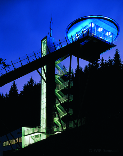 Die grundlegende Erneuerung der Großschanze Willingen (Mühlenkopfschanze) umfasste deshalb neben dem Neubau des Schanzenbauwerkes die Aufsprungbahn, die Neugestaltung der Zuschauerbereiche, die Erstellung von mechanischen Aufstiegshilfen und Funktionsräume. Kern der hochbaulichen Maßnahmen ist das wettkampfgerechte Schanzenbauwerk mit einem neuen Anlaufturm, welches als filigranes Stahltragwerk in die landschaftlich anspruchsvolle Situation integriert wurde und zahlreiche technische Einbauten bis hin zu einer mechanischen Schneepräparierung aufweist.