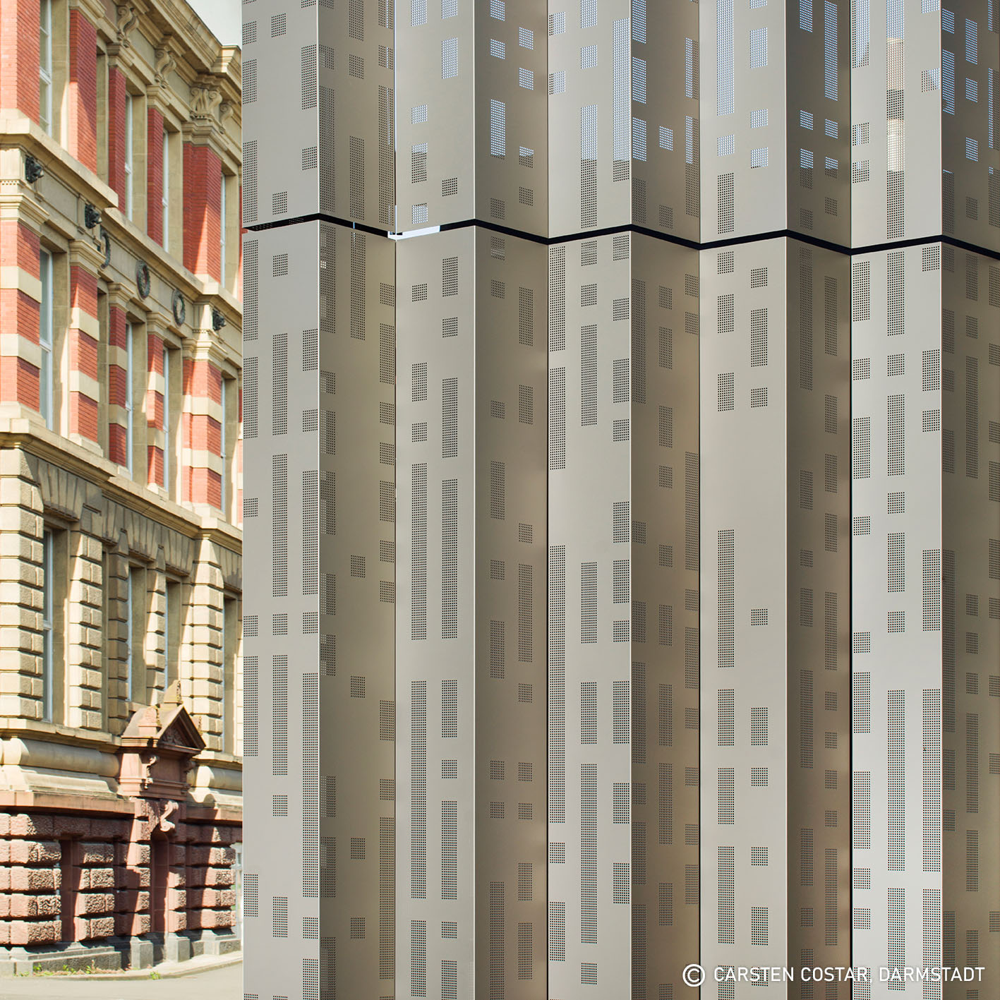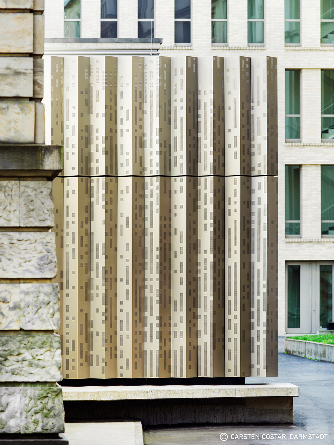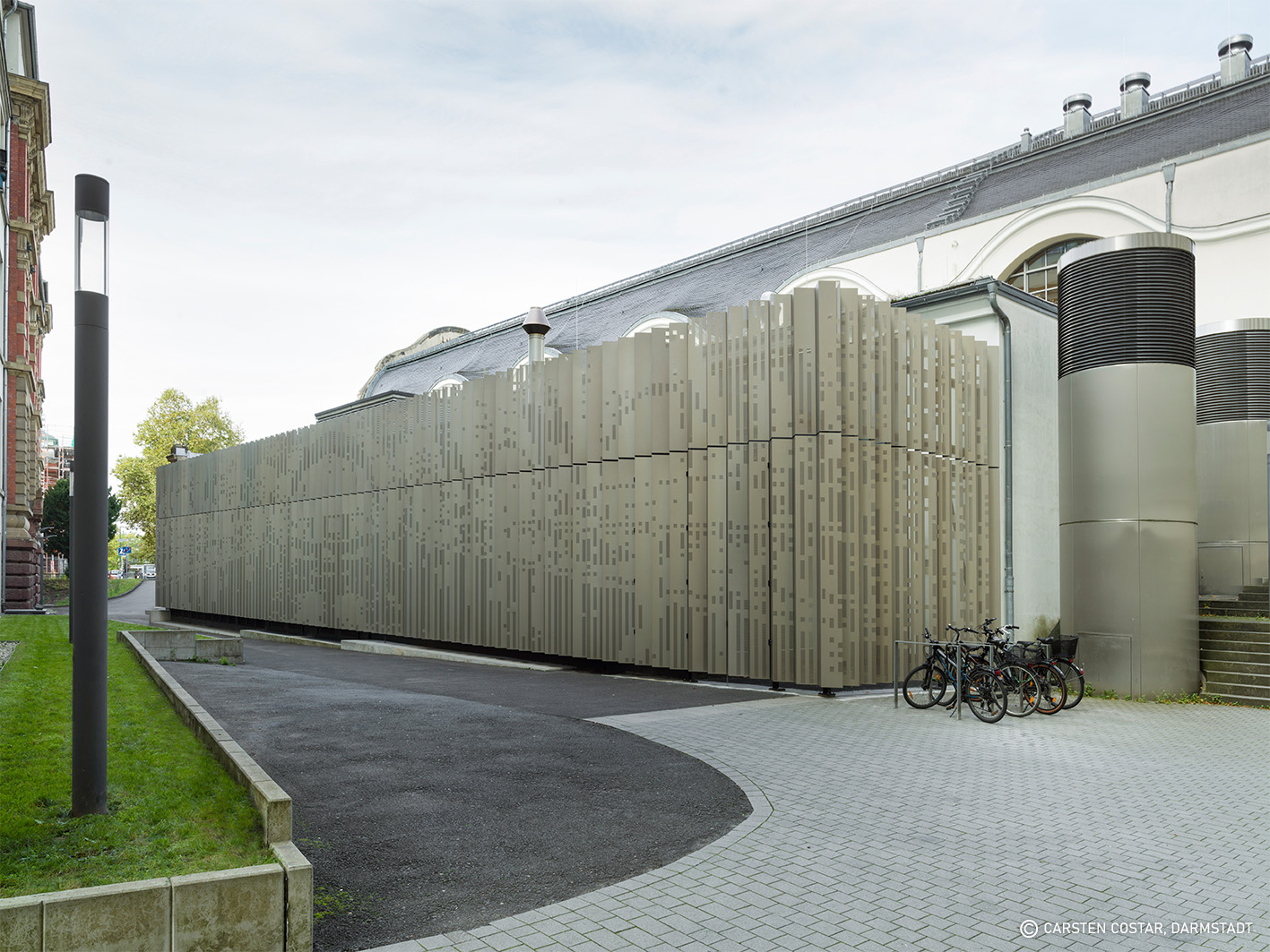 Der gesamte technische Anbaukomplex entlang des sogenannten Campusweges wurde mit einer gefalteten Vorhangfassade verkleidet. Die beiden Seiten der Faltung erhalten 2 verschiedene gelochte Pixelgrafiken. Durch die Faltung orientieren sich diese in die jeweilige Blickrichtung des Passanten. Die individuelle Bewegung ergibt dadurch ein sich kontinuierlich veränderndes Bild.