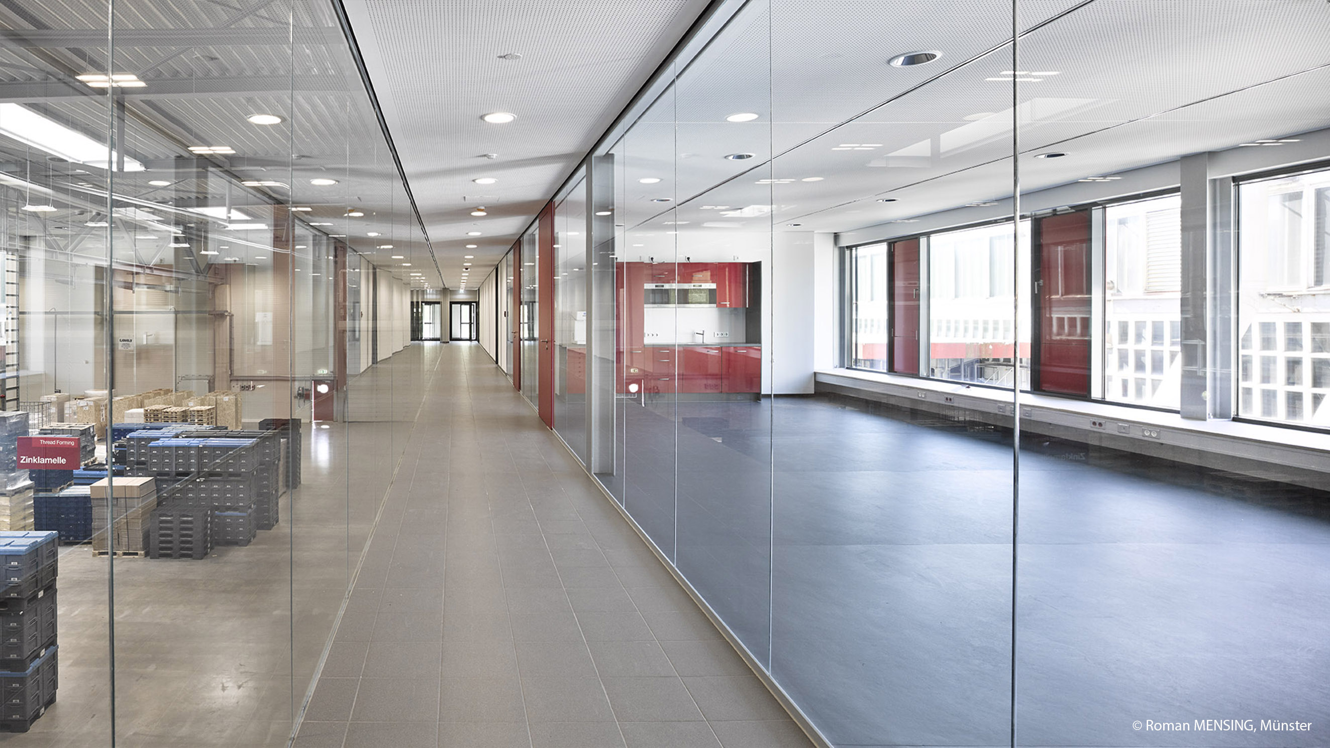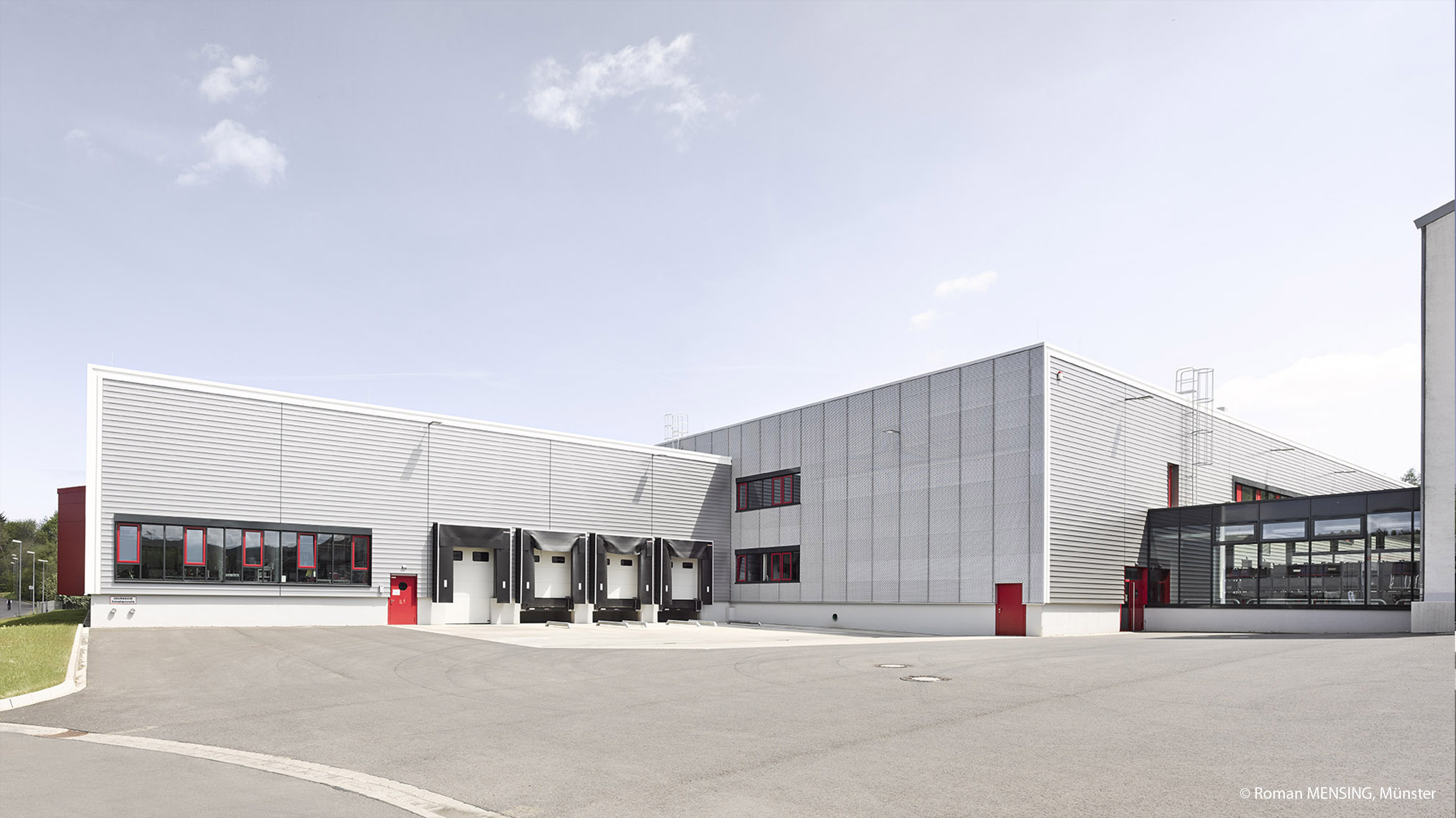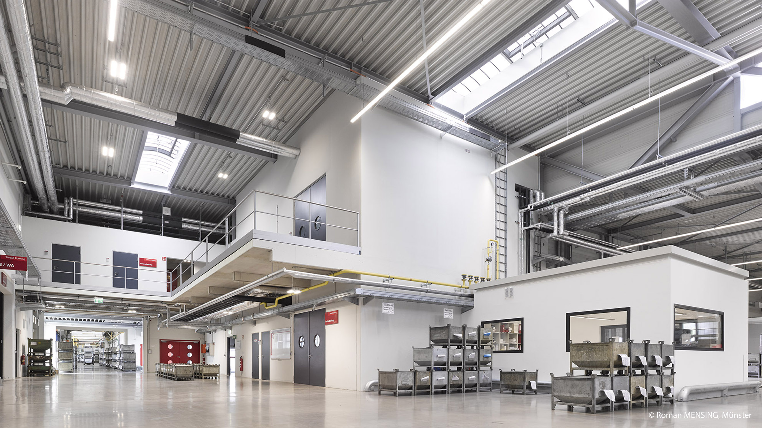 Die architektonische Konzeption sieht vor, dass ein Verbindungsbau die Klammer zwischen der bestehenden, architektonisch wertvollen Shed-Halle des Bestandes und dem Neubau auf gleicher Höhenlage der Hallenböden bildet. Hier wird der Anschluss sowohl für den Materialfluss von Halle zu Halle, als auch für die interne fußläufige Verbindung der Mitarbeiter über den zentralen Flur des Büroriegels im Erdgeschoss geschaffen.